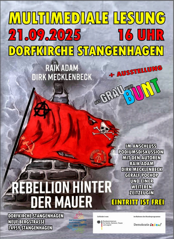 Am 21. September 2025 wird Geralf Pochop auf Einladung der Partnerschaft für Demokratie in die Dorfkirche Stangenhagen/Trebbin zu einer multimedialen Lesung kommen, der sich ein Gespräch mit dem Publikum und weiteren Zeitzeugen anschließen wird. Mit dabei sind Raik Adam und Dirk Mecklenbeck, Autoren der Graphic Novel „Rebellion hinter der Mauer“ über rebellische Jugendliche in der DDR. Zugleich wird Pochops Ausstellung „Aus Grau wird Bunt“ über Opposition in der DDR zu sehen sein.
