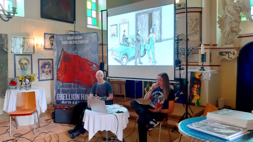 Zeitzeugen waren auch die Autoren Raik Adam (rechts) und Dirk Mecklenbeck, die zu Beginn der Veranstaltung aus ihrer Graphic Novel „Rebellion hinter der Mauer“ vortrugen, in der sie ebenfalls zurückblicken in die Zeit der Indoktrinierung und staatlichen Gängelung zum Ende der siebziger Jahre in der DDR.